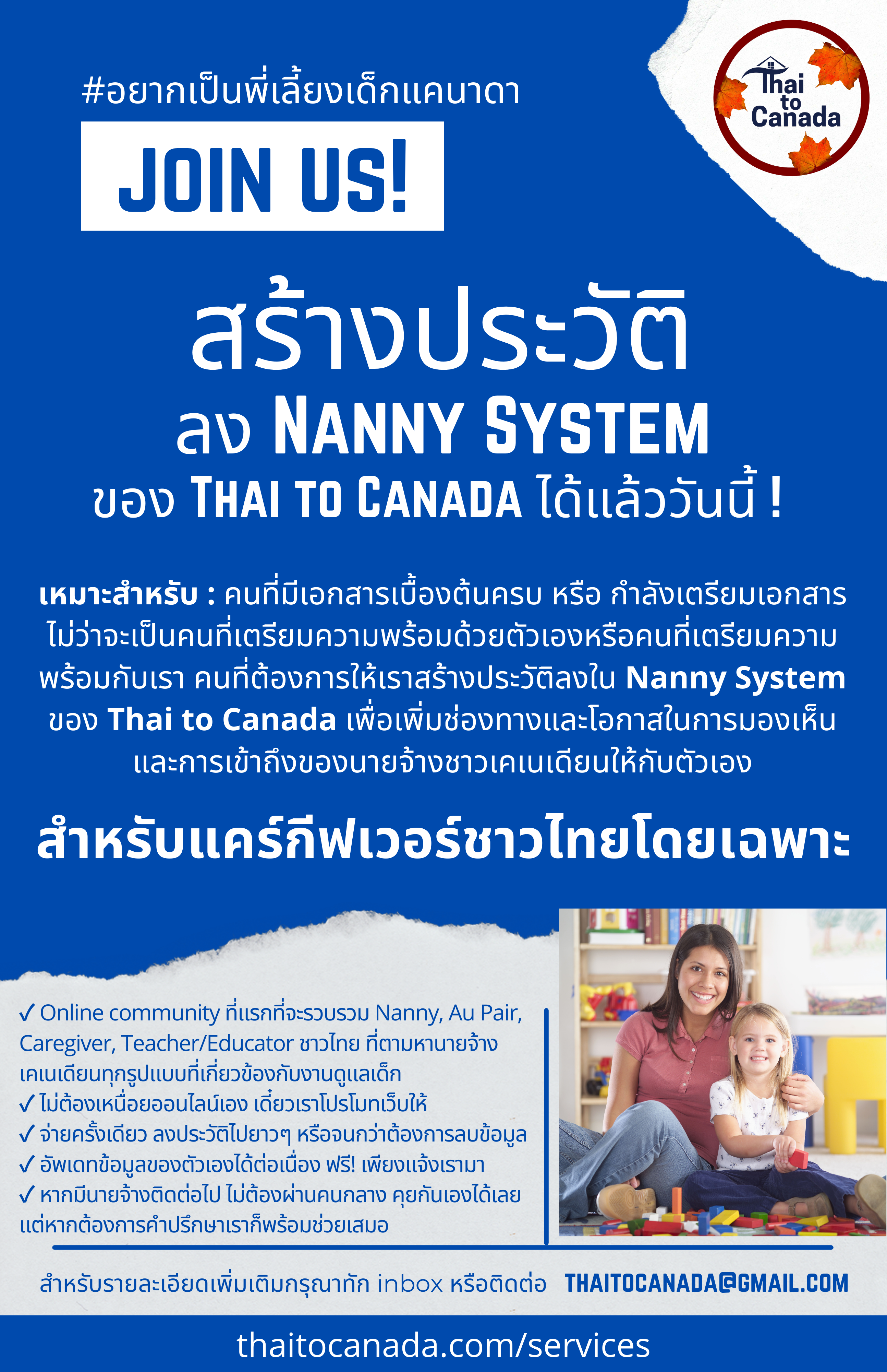 ยินดีต้อนรับสู่ Thai To Canada เพจรวบรวมข้อมูลเกี่ยวกับกระบวนการการหานายจ้างสำหรับงานแคร์กีฟเวอร์ของประเทศแคนาดาที่สามารถย้ายถิ่นฐานและเป็นพลเมืองแคนาดาได้ภายใน 2 ปี จัดทำเพจขึ้นโดยอดีตออแพร์อเมริกาและแคร์กีฟเวอร์ในแคนาดา